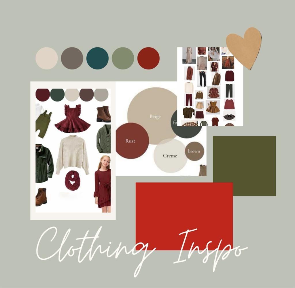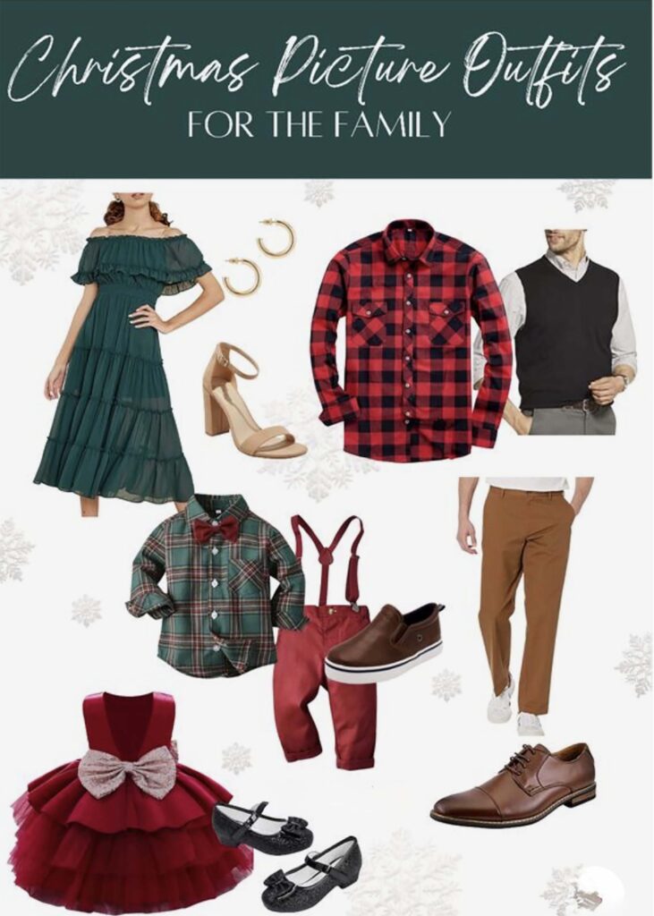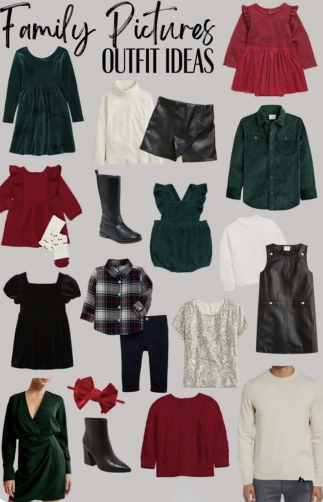 Christmas pj’s, red, and green tartan outfits cream-colored, sparkled clothing, and brown tones would suit best.
