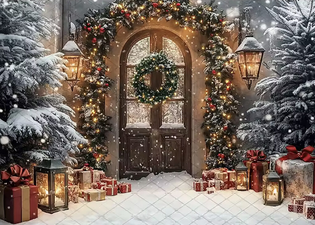 Theme 2: Snowy Christmas Tree Door Scene – Here, in this setup, will be light snowy colors, including props like a white Christmas tree, snow, lights, a white horse, etc.