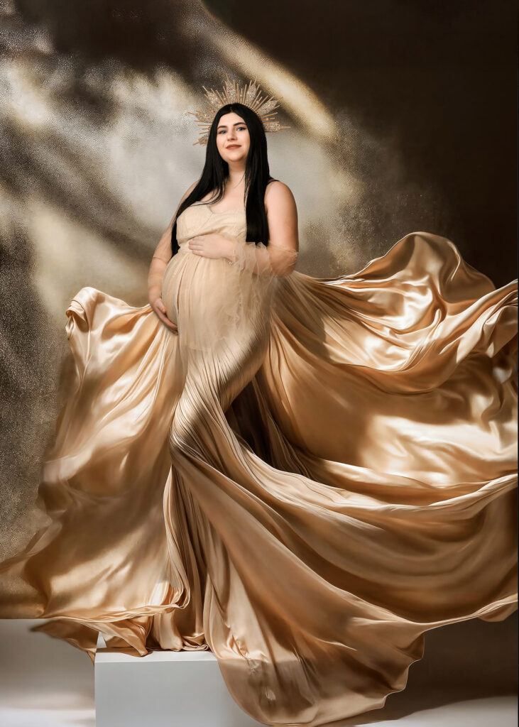 For your session, you can choose between a studio or an outdoor setting. If you prefer outdoors, we’ll plan and agree on the perfect location during the booking process. For studio sessions, like Anca’s, I provide a selection of maternity gowns and outfits and guide you on what to bring, including suitable undergarments and styling tips.