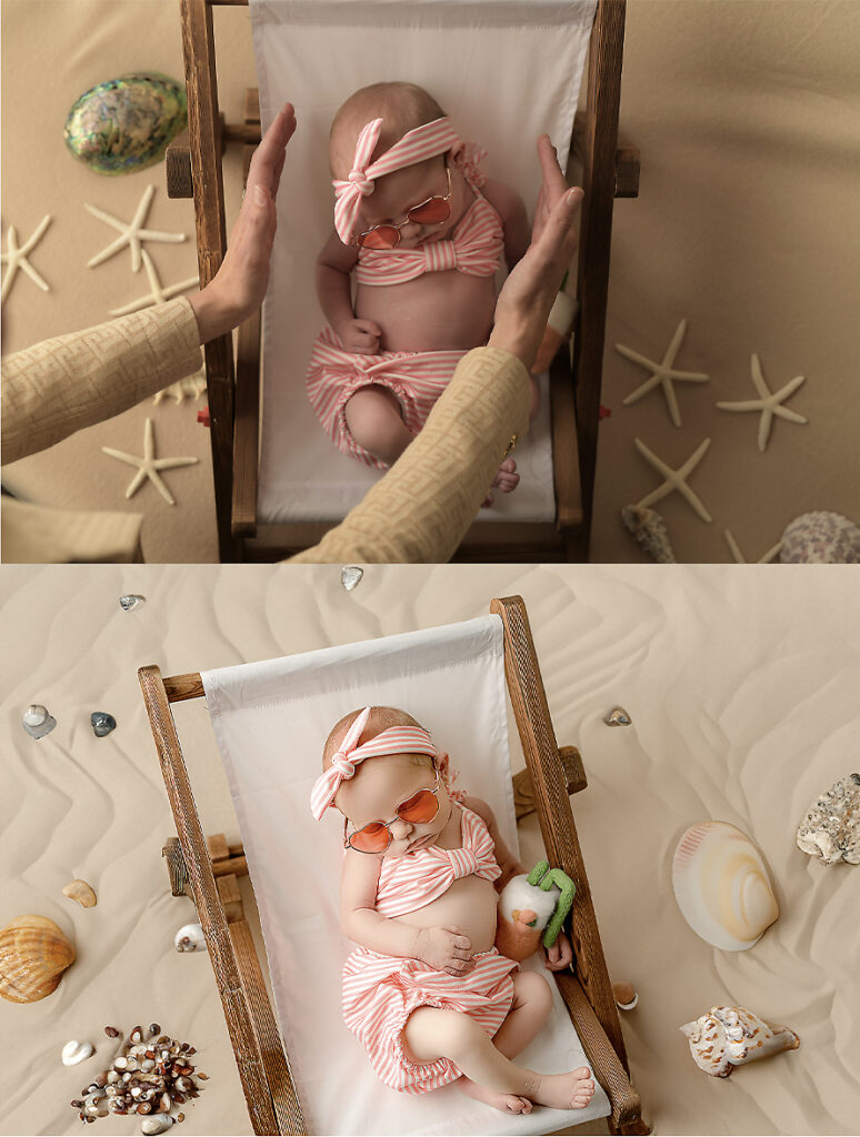 This popular pose is known as the “froggy pose” and should always be created as a composite of two images, to ensure that the baby’s head is supported at all times.
